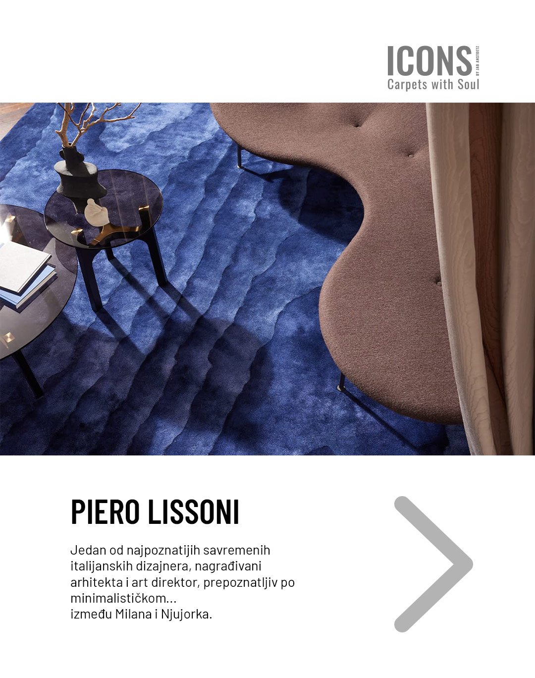ICONS kolekcija okupila je šest svetski priznatih dizajnera sa tri kontinenta, iz oblasti arhitekture, tekstila, produkt dizajna i umetnosti, koji tepih doživljavaju kao sofisticiran medij kreativnog izraza. Upravo zato JAB™ ovu kolekciju naziva Carpets with Soul.